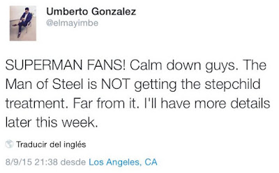 "¡FANS DE SUPERMAN! Tranquilos, chicos. El hombre de acero NO va a recibir el tratamiento de hijastro. Ni mucho menos. Tendré más detalles a final de semana."